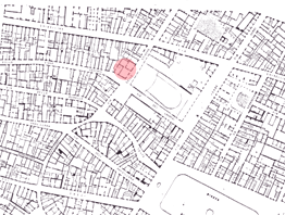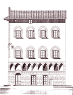 Fig. 1- Palazzo Da Cintoia, prospettiva di piazza S. Simone con la tipica veduta di spigolo che caratterizza il palazzo. Lo spazio che separa via delle Stinche da via della Vigna vecchia era sede di molte proprietà delle famiglia da Cintoia. Fig. 2 - Palazzo Da Cintoia, posizione dell'edificio nel Quartiere di S. Croce. L'edificio affaccia su via delle Stinche e via della Vigna Vecchia a pochi passi dalla piazza di S. Piero con l'omonima porta. Sulla destra in basso Piazza S. Croce. Fig. 3 - Palazzo Da Cintoia, pianta del piano terreno del palazzo. Sono visibili i tre grandi saloni comunicanti, vani quadrangolari, adibiti in origine a spazi commerciali che organizzano il primo livello che da sulla strada. La pianta è costruita secondo una grammatica elementare: accorpamento di vani e volumi. Fig. 4 - Palazzo Da Cintoia, Sezione trasversale del palazzo in corrispondenza del primo salone al piano terreno. Sono visibili le scale e i tre livelli sui quali è organizzato tutto l'edificio. Anteprima tavola tratta da " I palazzi del rinascimento, Firenze, 1989. |