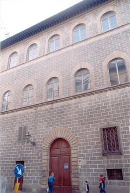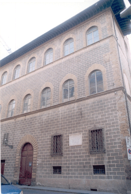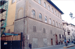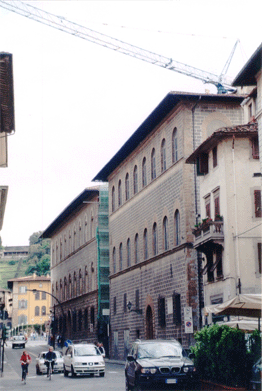 Fig. 4- Palazzo Busini-Bardi, vista del portale d'ingresso. Il palazzo costruito intorno al 1420-27, rappresenta una tappa determinante per il raggiungimento della nuova forma rinascimentale. Il "nuovo" palazzo dei Busini è fondamentale elemento di transizione verso il tema maturo del nuovo palazzo rinascimentale fiorentino. Fig. 5- Palazzo Busini-Bardi, facciata. L'edificio si allineava al "rudimentale" repertorio tardo gotico per motivi legati al clima culturale degli anni '20 che consigliavano di "conservare" molti codici del precedente programma ma presentava una particolare sofisticatezza ed euritmia di impianto e di facciata. Fig. 6- Palazzo Busini-Bardi, vista del fondale di via de' Benci. All'interno delle visuali di via de' Benci, piazza di S. Croce, Corso Tintori e Borgo S. Croce la mole del palazzo rimane come presenza gerarchicamente predominante soprattutto in relazione alle connotazioni degli altri palazzi. Fig. 7- Palazzo Busini-Bardi, veduta dello slargo in corrispondenza di Corso Tintori. All'epoca della costruzione erano presenti nella piazza altri edifici di pregio tutti volumi molti diversi e non confrontabili: la monumentalità delle sue proporzioni rimaneva la protagonista nel rapporto che stabilisce con lo spazio circostante. |