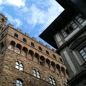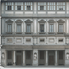 Fig. 1- Prospetto degli Uffizi. Giorgio Vasari; via Nuova degli Uffizi, Firenze 1560-65, partito della facciata. Questa porzione del prospetto, costituita da un portico a tre fornici al piano terreno e tre finestrature ai piani superiori, rappresenta il modulo dell'intero fronte esterno. Fig. 2 - Complesso degli Uffizi, planimetria. Il perimetro del complesso museale dal Lungarno de' Medici a Piazza della Signoria. Nel nome stesso è contenuto il significato della sua originaria destinazione. Sotto Cosimo I si era infatti resa necessaria un sede ampia e prestigiosa per le tredici Magistrature e per gli apparati amministrativi del governo, per gli uffici dunque, o come allora si chiamavano, gli "Uffizi". Fig. 3 - Complesso degli Uffizi, sezione trasversale dell'intero isolato. In nero al centro la porzione che corrisponde al piazzale degli Uffizi. A sinistra la Tribuna ottagonale e a destra il sistema di scale di accesso al Museo. Fig. 4 - Complesso degli Uffizi, veduta aerea. Sulla sinistra della fotografia è visibile il fotomontaggio con la posizione delle nuova pensilia di Arata Isozaki. Nell'idea progettuale la pensilina nasce anche da una matrice urbanistica risultando un ideale prolungamento di via Lambertesca (sulla destra).